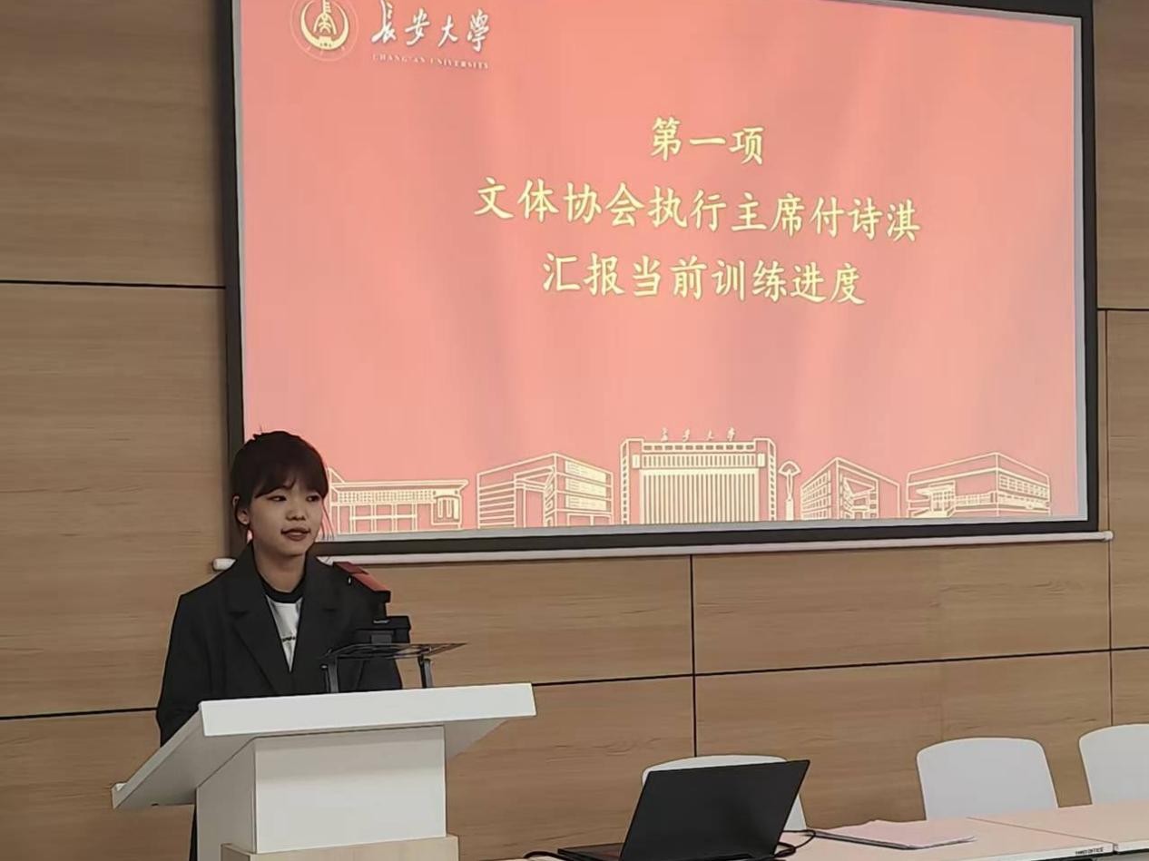 文体协会执行主席付诗淇围绕前期工作完成度、项目训练情况、目前存在问题等方面进行阶段性汇报,并针对训练中存在的体能分配、技术细节等问题提出解决方案。