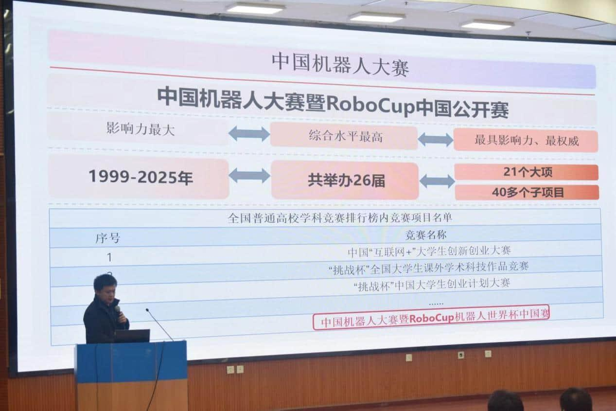 机器人队的发展历程、技术难点突破、团队协作技巧等维度,为同学们深入讲解了机器人大赛的核心价值与挑战。他鼓励同学们以赛事为契机,将理论知识转化为实践能力,在创新探索中突破自我。