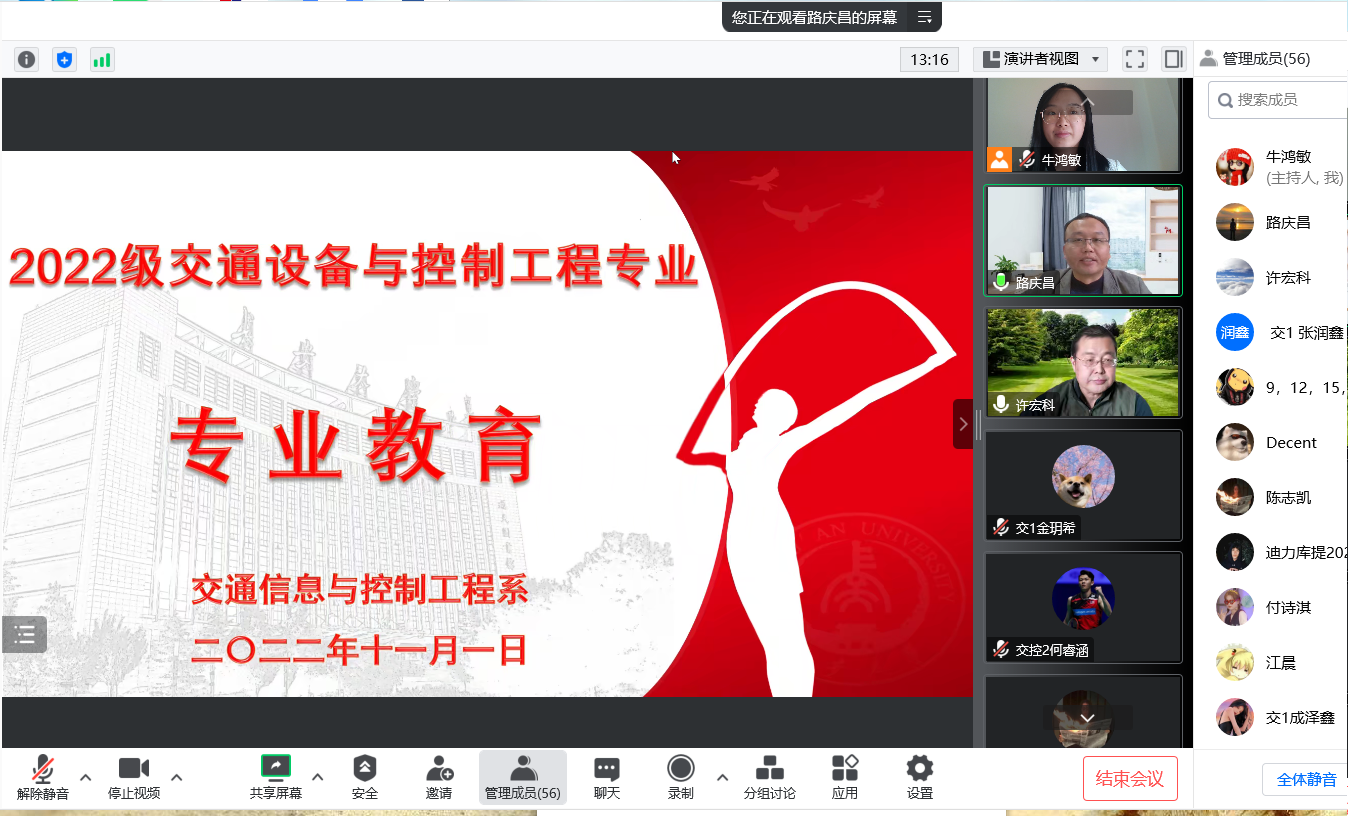 为了进一步加强对交通设备与控制工程专业的认识,了解专业发展历程和行业特点,明确学习目标,做好学业规划,为今后的学习和职业发展打好基础,11月1日下午,2022级交通设备与控制工程专业1班、2班联合举办了 “交通设备与控制工程专业教育与学习经验交流”报告会。会议由两位班主任联合主持,特邀许宏科教授、2019级刘露同学和2020级张兴浩同学进行专业教育和学习经验分享。